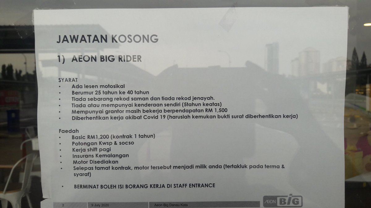 RM 2000 a month. AEON BiG Danau Kota Lot 9834 Jalan Langkawi Danau Kota. One year contract Working hours 11am 8pm including weekendpublic holiday One 1 day off will be given in a week Applicant must be a Malaysian citizen Loss of employment because of COVID19 pandemic please provide supporting document ie employee termination letter Must have a valid driving license B B2.