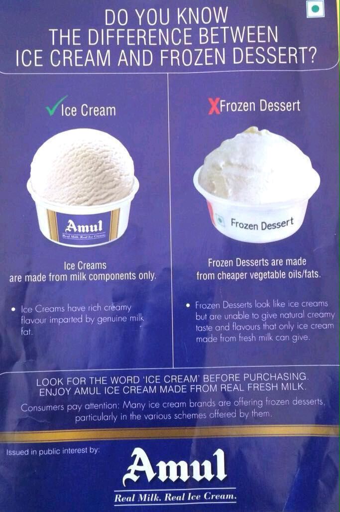 An ice-cream is made from milk fats while a frozen dessert is made from vegetable oil fats. In ice creams Amul and Baskin Robbins were found with higher fat percentage. The ads prompted Hindustan Unilever Ltd HUL makers of Kwality Walls frozen dessert and ice creams along with Vadilal Industries Ltd.
