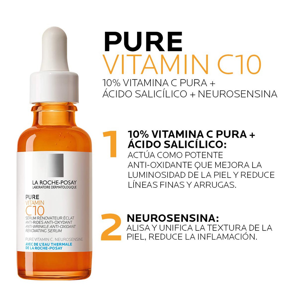 La Roche-Posay 10 Vitamin C Serum is an anti-aging facial serum formulated with 10 pure vitamin C Neurosensine and salicylic acid to smooth skin texture while improving brightness. The science behind La Roche-Posay Pure Vitamin C10 Serum. La Roche-Posay Redermic C Anti-Wrinkle Vitamin C Moisturizer with Pure Vitamin C Hyaluronic Acid for Normal to Combo Skin 135 Fl.